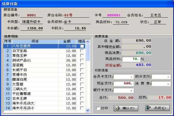 • 下面為結(jié)算付款界面圖: (一)功能介紹 Super餐飲會(huì)員管理系統(tǒng)主要分為七大模塊:前臺(tái)營(yíng)業(yè)、商品管理、會(huì)員管理、數(shù)據(jù)維護(hù)、統(tǒng)計(jì)查詢、系統(tǒng)管理、系統(tǒng)設(shè)置。 一、前臺(tái)營(yíng)業(yè) 一般的前臺(tái)日常業(yè)務(wù)包括:前臺(tái)接待收銀、顧客預(yù)約、收費(fèi)日?qǐng)?bào)結(jié)賬管理等。 二、商品管理 主要是商品…